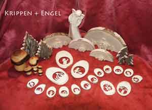 aus Birken, Erlen & Fruchthölzern: a) Krippen aus Birkenholz für CHF 11.-- / 13.50 / 17.-- / 19.50 / 36.-- / 49.-- b) Astscheiben für CHF 4.-- / 7.-- / 9.-- c) Bäumchen ab CHF 4.-- d) Pilze ab CHF 2.50 |